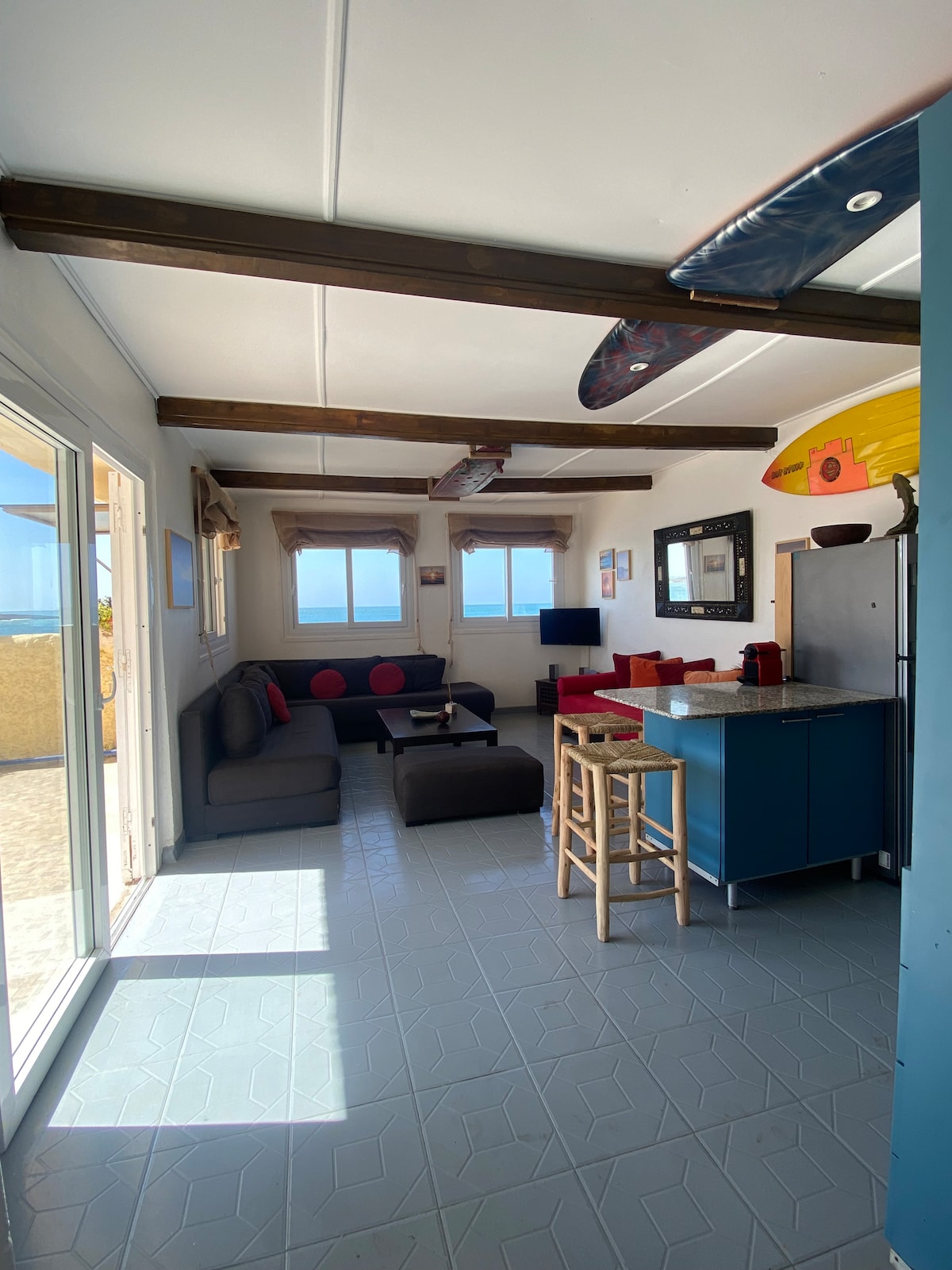 Apartamento panorámico bañado por el sol con terraza frente al mar y pequeña piscina privada. Suite parental con TV y baño. Segundo dormitorio con acceso a la terraza. Segundo baño. Cómodo salón, TV de 50", Netflix y wifi, cocina equipada con barra, aire acondicionado central. Residencia vallada y segura con aparcamiento y garaje. Gran piscina comunitaria abierta todo el año. Playa de Cherrat y Bouznika a pocos minutos. Tranquilidad absoluta. Ideal para familias y parejas.