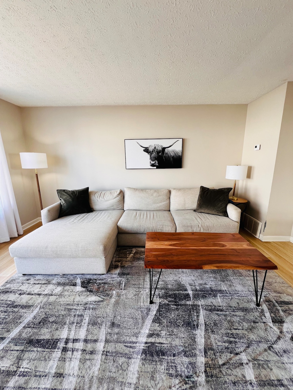 Esta espaciosa unidad de 1200 pies cuadrados tiene un dormitorio tamaño king. Con dos salas de estar. La segunda sala de estar tiene una cama tamaño queen. Tiene una cocina completa con lavadora y secadora. A solo una manzana de la plaza. Puedes disfrutar de la lujosa cafetería y de un delicioso asador en la plaza con pequeñas boutiques y tiendas. ***Esta unidad está arriba y solo tiene escaleras.
