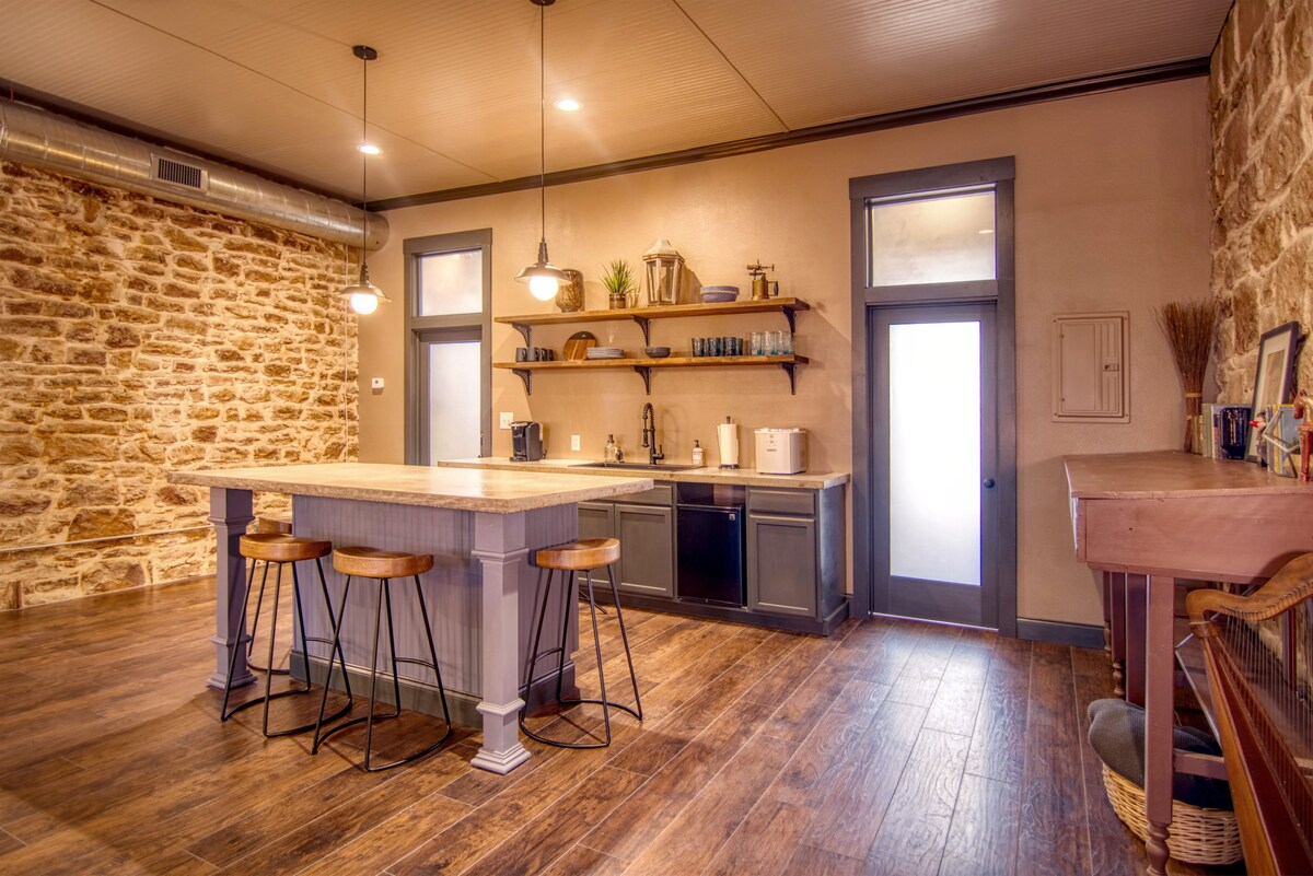 This newly renovated 1,850 square foot loft offers a unique and stylish view of the Mason Square. Situated downtown on the second floor of a historic stone building, it harmoniously combines the hand-carved stone walls from 1884 with a modern, sophisticated, and comfortable aesthetic.