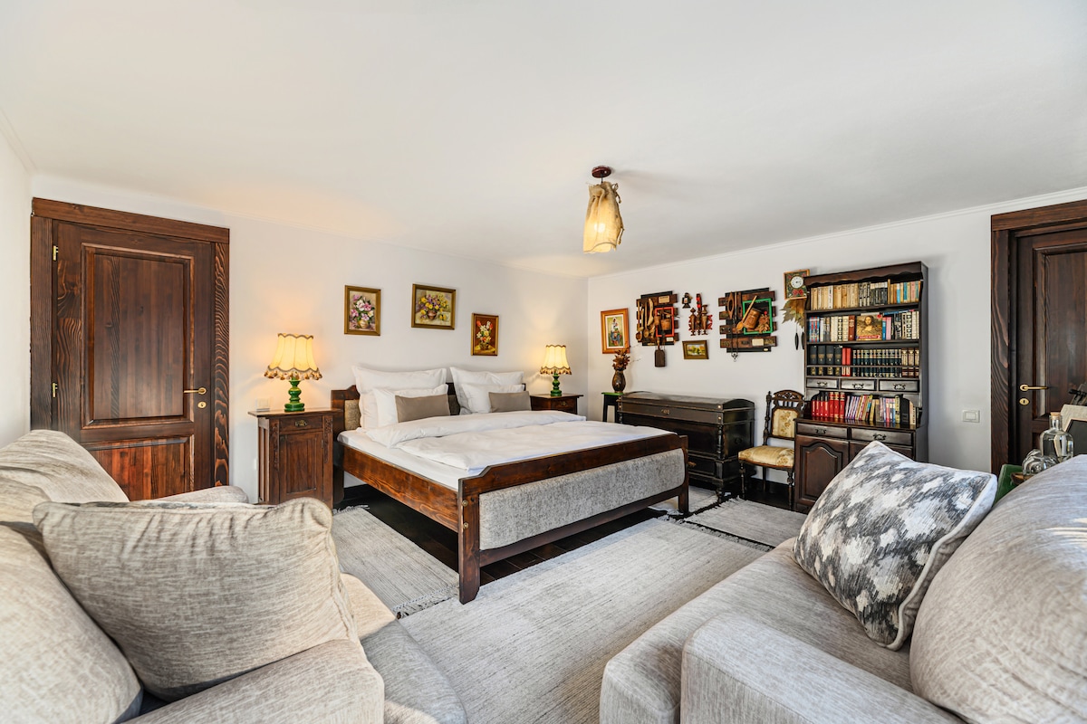 Înconjoară-te cu stil în acest spațiu remarcabil creat special pentru dumneavoastră cu produse de calitate. Apartamentul este compus din 2 dormitoare cu pat matrimonial, fiecare având bai proprii și un living cu canapea și chicineta, cu un șemineu electric și un TV. Ambele dormitoare au balcon propriu de unde priveliștea spre Curtea interioara oferă relaxare iar sunetul raului este îmbinarea perfecta.