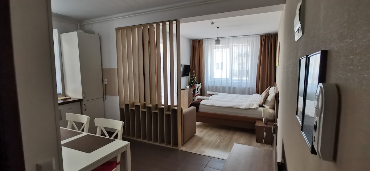¡Despiértate con impresionantes vistas a los Cárpatos desde tu balcón privado! El estudio Alpine Escape Mountain View combina comodidad, estilo y conveniencia, a solo 5 minutos del centro de Brașov. Perfecto para paseos festivos en el mercado navideño, fines de semana de esquí, caminatas de verano o una escapada tranquila para trabajar desde cualquier lugar. ¡Acogedor, moderno y listo para tu escapada de invierno!