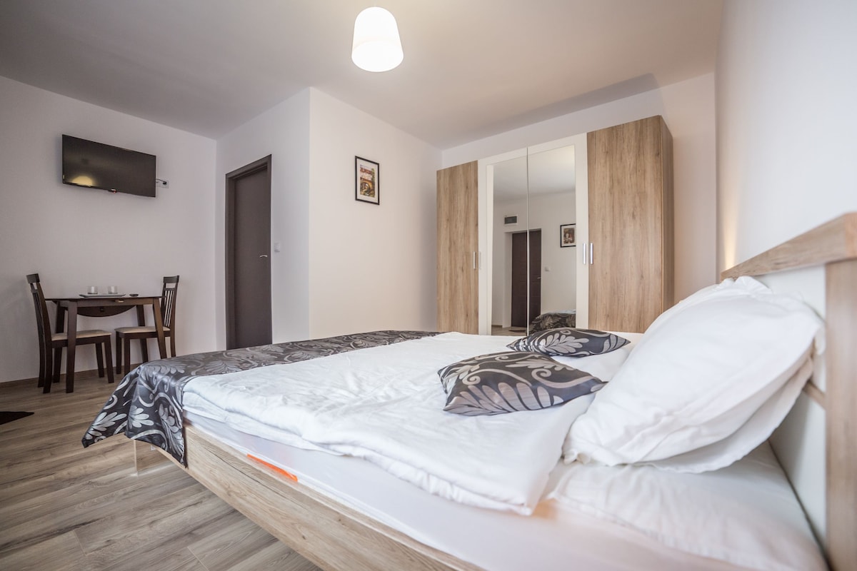 Disfruta de una estancia encantadora en nuestro lugar único. Situado en una zona privada residencial tranquila, en la carretera a Poiana Brasov, estarás cerca del centro antiguo de Brasov (1,2 km), pero al mismo tiempo de camino a las pistas de esquí en Poiana Brasov (10 km). El estudio 14 incluye una sala de estar con una cama doble, un baño, una zona de cocina, un balcón privado y está equipado con todos los servicios que puedes necesitar para una estancia cómoda que incluye WiFi y TV por cable.