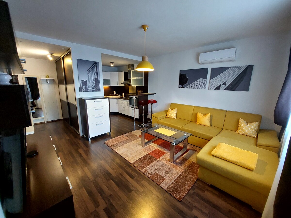 Elegante apartamento de 2 habitaciones en el nuevo centro de la ciudad de Bratislava, a 100 metros del centro comercial donde se puede encontrar el mercado, patio de comidas, techo de jardín, estación central de autobuses. A 10 minutos a pie del centro antiguo de la ciudad. Un montón de pequeños pubs locales, cafeterías y vinotecas. A pesar de la ubicación céntrica, la zona está llena de parques, árboles y parques infantiles. El piso tiene dormitorio con cama doble, sala de estar con sofá cama para 2 personas, cocina totalmente equipada, 2 balcones, lavadora, lavavajillas, wifi, TV, etc.