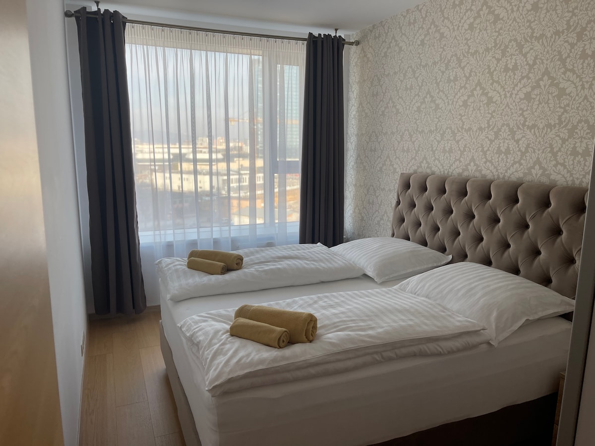 - 24/7 self-service check-in/check-out - Free parking in the parking garage - Panoramic view from a height of 90 m above the ground (30th floor) - 80 m2 apartment with 2 bedrooms - Fully equipped kitchen set - free coffee and tea (espresso Tchibo) - Smart TV with YouTube and Netflix - Unlimited Internet - Towels, bed linen, shower gel, glasses, and kitchen equipment are included in the apartment free of charge.