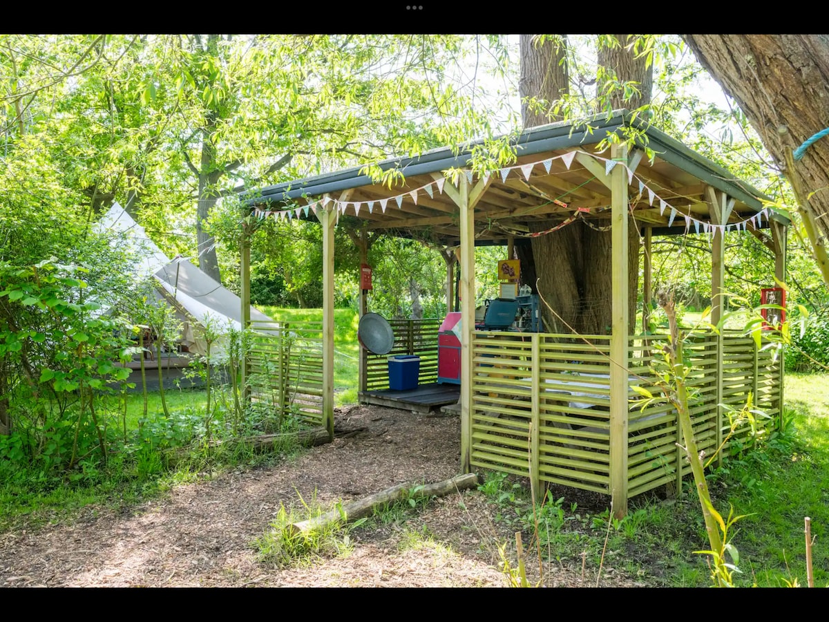 Disfruta del encantador entorno de este lugar romántico en la naturaleza. Tienda de campaña de 6 metros ideal para una escapada romántica en pareja o para pasar un rato en familia juntos. Tiene su propia zona cubierta con barbacoa: fogata y asientos. Inodoro compartido e instalaciones de lavado Cama tamaño king y 4 camas individuales El teléfono se carga a través de USB en la tienda; las luces de la tienda funcionan con energía solar Se suministra toda la ropa de cama (no toallas). Se puede añadir un desayuno cocinado por un coste adicional de 7,50 £ por persona.