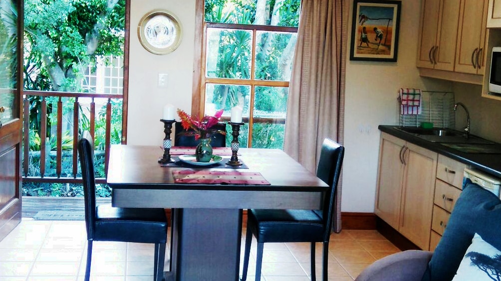 Our Garden Studio is on the ground floor onto our beautiful garden 5km west of Knynsa town. It is quiet and tranquil with all you need for a relaxing restful holiday or overnight stay. Within minutes you can walk to the lagoon or take short trip into town for dinner. We are situated just off the N2, well out of the main CBD which is why our beautiful suburb is so serene and peaceful. Sip cocktails on the patio and enjoy our lovely forested garden.