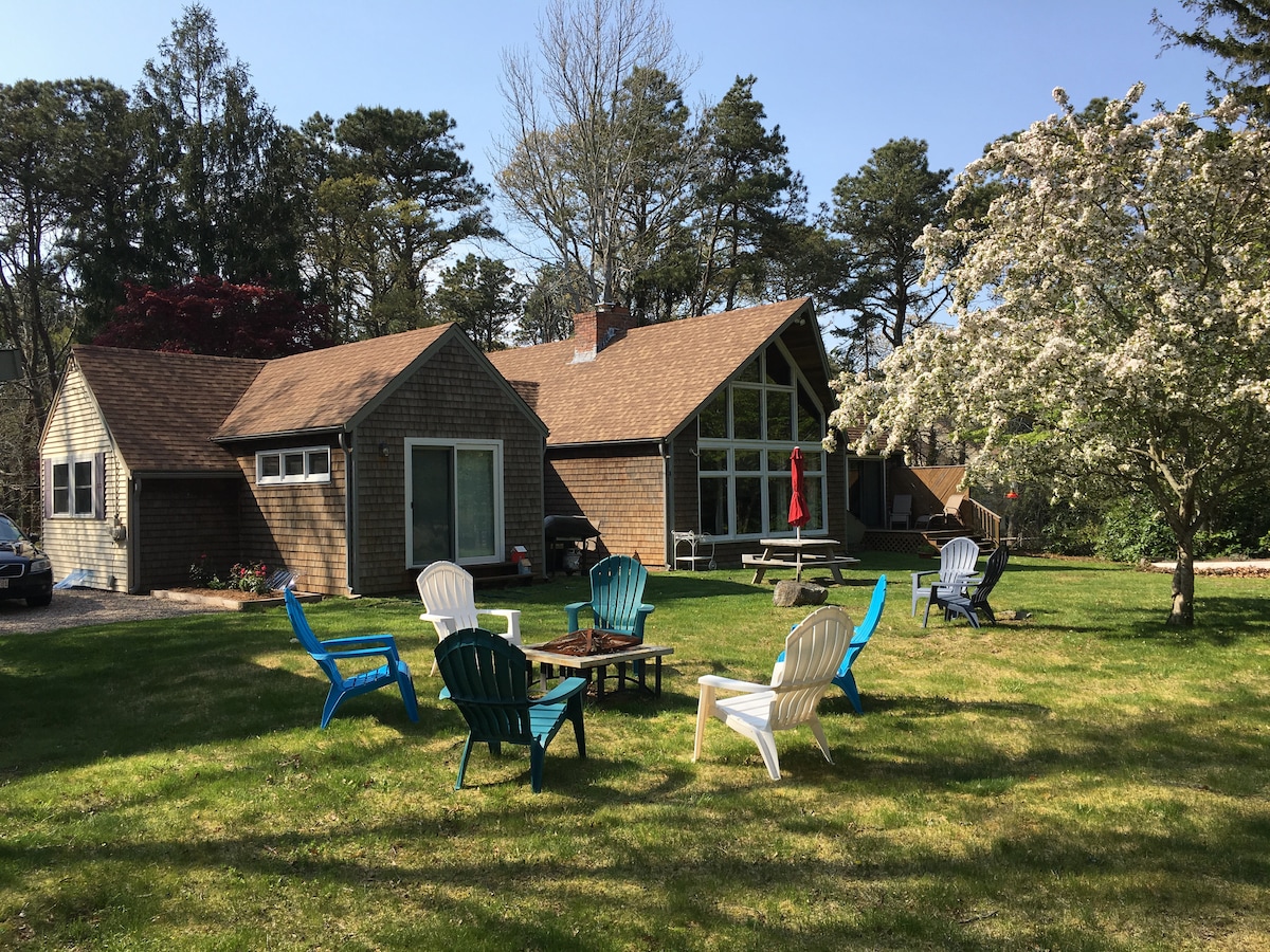 Vivienda actualizada, espaciosa y tranquila en Mid-Cape Camino privado, playa/estanque privado (5 minutos a pie) Aire acondicionado central silencioso 4 BR/3 full bth: > Planta baja: 2 habitaciones + 2 baños - capacidad para 4 personas > Planta superior: 2 habitaciones + 1 baño - capacidad para 4 personas Pisos de madera Porche grande con mosquitero Sala grande: 2 sillones reclinables de cuero y sofá, estufa de gas Jøtul, televisor OLED de 65” Patio boscoso: mesa de fuego de gas, parrilla Ping pong - (sótano sin terminar) Cerca de un sendero para bicicletas de 25 millas de largo, playas, golf/minigolf, tenis, navegación Por favor, no fumes