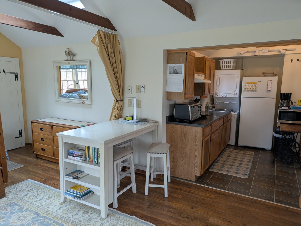 Apartamento estudio luminoso, soleado, aislado y verde de 600 pies cuadrados en la parte trasera de una casa antigua en el corazón de Brewster, al norte de Rt 6A. Entrada privada. Patio trasero privado con césped y jardines. Pequeña terraza privada, parrilla de gas. Las aves y los animales pequeños abundan en el exterior. Toneladas de estrellas por la noche... aire salado en el viento. Distancia a pie a cafetería, tienda de conveniencia, varios restaurantes, sendero para bicicletas. A poca distancia en coche de las playas de la bahía, a poca distancia en coche de las playas del océano. "Estufa de leña" de gas para calefacción, aire acondicionado para la refrigeración.