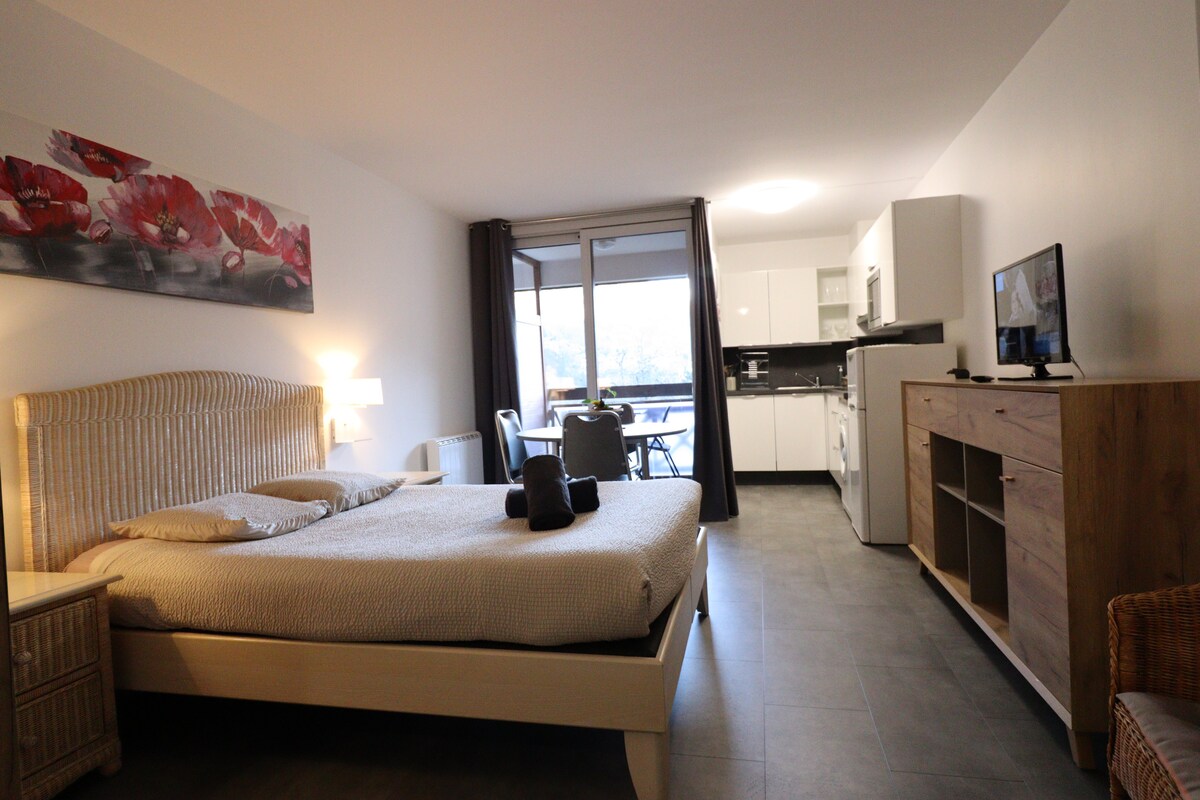 Estudio acogedor, cómodo y cálido. está situado en el centro de Brides les bains a 200 m del centro de la ciudad, del establecimiento termal y de la parada de autobuses para llegar a Salins. También está muy cerca del telecabina del Olimpo(el acceso a Meribel) Está clasificado con 2 estrellas por la comodidad de los curiosos El estudio ha sido todo rehecho Se encuentra en el 3er piso del condominio Villa Louise La vista da al hotel du Golf El estudio tiene un balcón que se amplía y permite comer fuera
