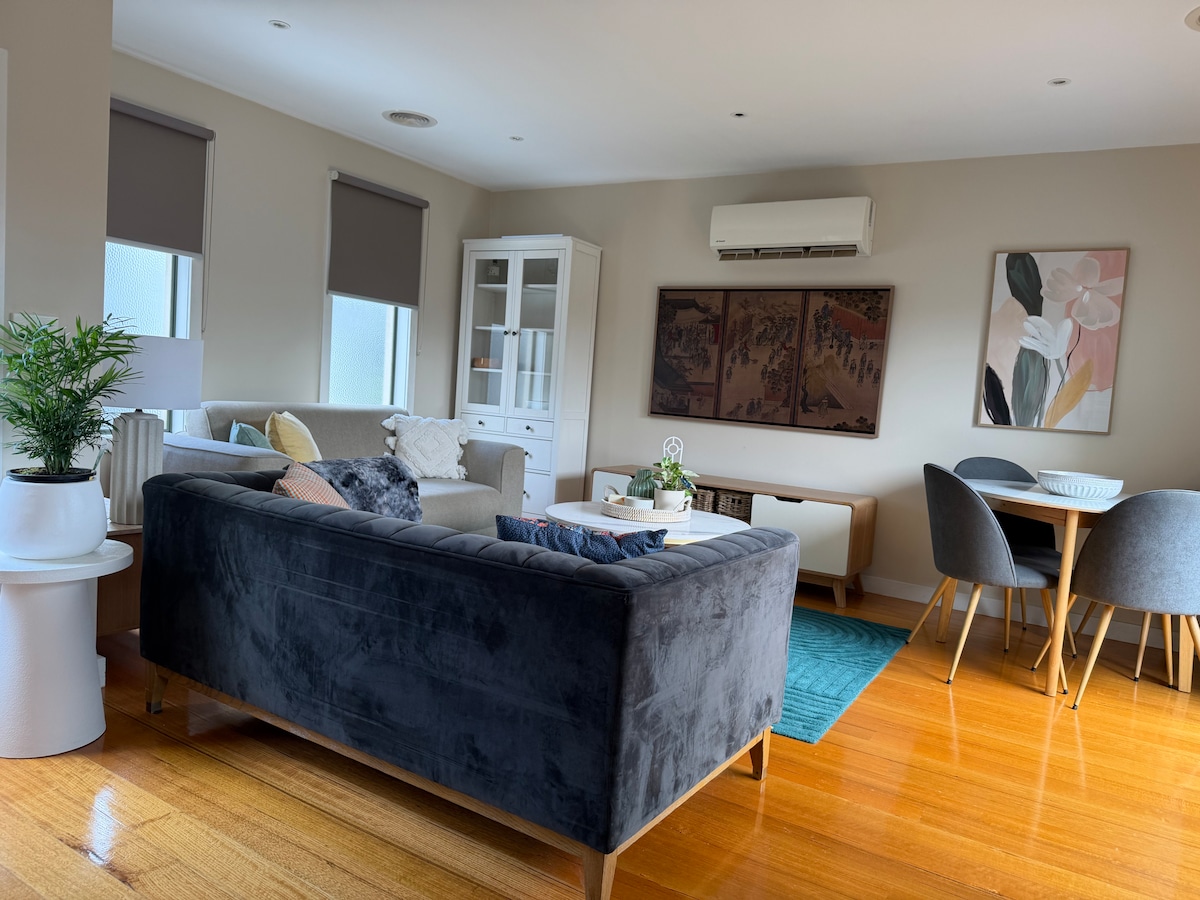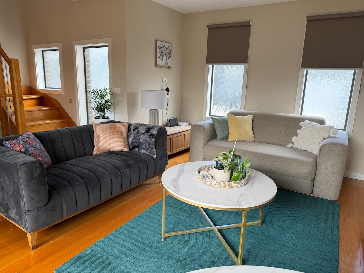 Casa adosada entera de 2 dormitorios y tres niveles con dos camas tamaño queen y sofá cama Koala en la sala de estar. Convenientemente ubicado en Footscray cerca del hospital y a solo 7 km del distrito financiero de Melbourne. 2 baños, un balcón al aire libre y garaje seguro para un vehículo. Cuenta con TV inteligente de 65pulgadas con internet de alta velocidad, cafetera, freidora de aire, microondas, tostadora, arrocera, lavadora secadora y todo lo necesario para una estancia relajante.