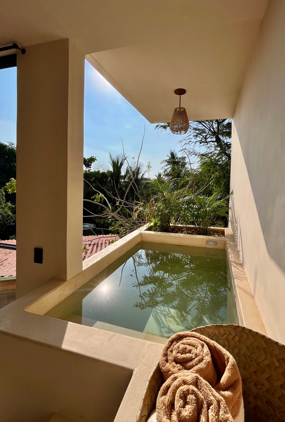 Depa amplio y luminoso en planta alta con 2 camas queen súper cómodas, A/C en la recámara y ventiladores en sala y cocina. Cuenta con cocina equipada, salita acogedora y balcón con vista a palmeras. Estás a solo 2 min de la playa y a 1 min de cafés, tiendas y restaurantes. Disfruta el patio compartido con hamacas, árboles frutales, asador y área de pesas artesanales. Ideal para relajarte, surfear o trabajar remoto con buena vibra.