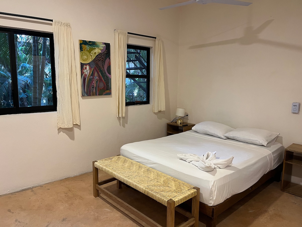 Disfruta de un tiempo de descanso en esta acogedora habitación después de un largo día bajo el sol. Cama doble para uno o dos, acc, ventilador, televisión y un baño privado. Todo esto en medio de pequeños senderos, cerca de la piscina compartida con nuestros otros huéspedes, la sombra de Neems, la hamaca a pocos pasos frente al mar y caminar a solo 60 metros por la carretera donde puedes esconderte en la arena y relajarte. O surf! Haz que sea TU aventura.