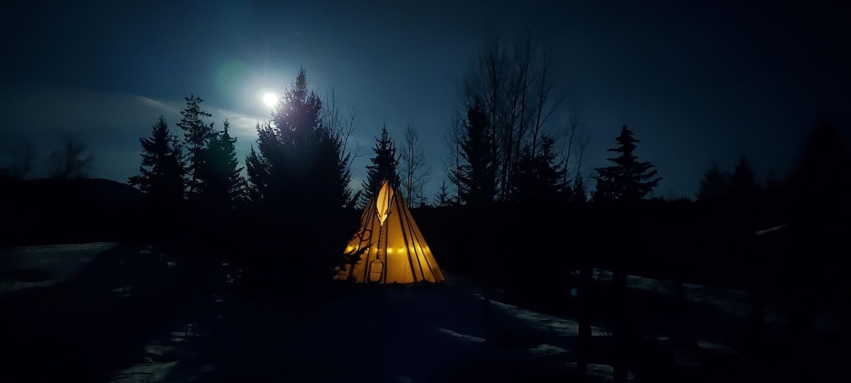 Glamping de lujo TiPi. Cómoda cama tamaño queen con mantas y pieles, muebles rústicos. Nuestro lugar se encuentra en una primera nación, rico en historia y cultura. Te invitamos a venir y ser nuestro huésped. *Glamping TiPi #2 y #3 también disponibles No querrás marcharte de este lugar encantador. Perfecto para una escapada en pareja.
