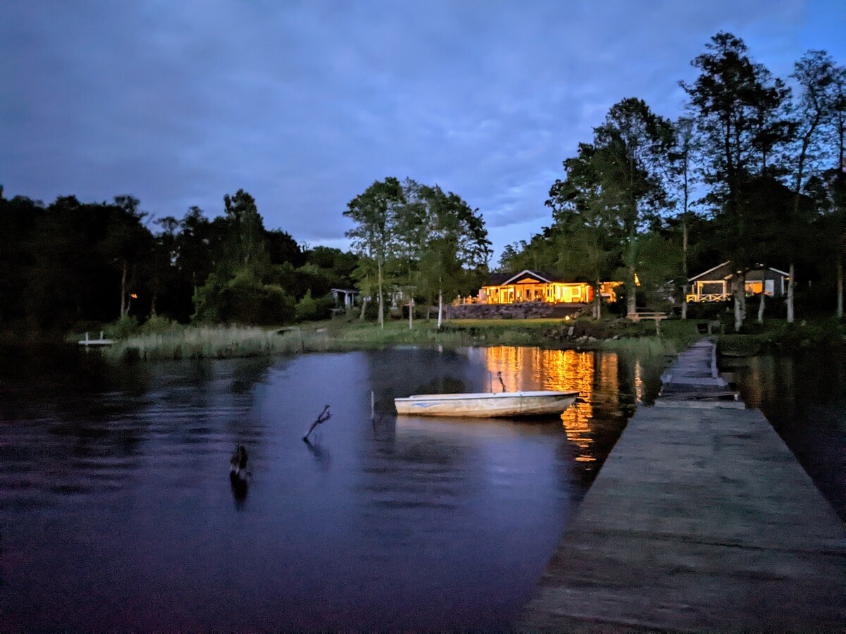 ¡Estamos deseando recibirte en Villa Gerastorp! La casa de campo privada está justo al lado de un lago y con hermosos alrededores justo al lado del bosque. 5 dormitorios grandes y áreas sociales de buen tamaño repartidas en 2 pisos y 2 casas de huéspedes primos justo al lado de la casa principal. Amplio porche exterior que incluye un generoso salón y tumbonas. Disfruta de un baño en el lago desde tu embarcadero privado o ¿por qué no probar la sauna al aire libre de madera quemada y la tradicional bañera de hidromasaje nórdica?