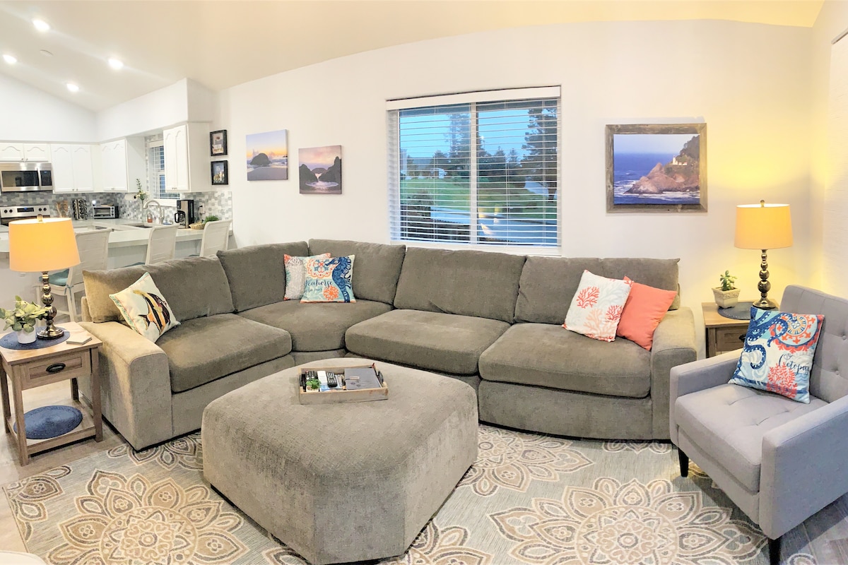 ¡Ubicado en el corazón de Brookings, OR, a menos de una milla de Harris Beach! A momentos del Samuel H. Boardman Scenic Corridor, senderismo, kayak, rutas en bicicleta, el puerto y el puerto deportivo. Secuoyas a 30 minutos. Generosas vistas al mar, sala de estar de 1500 pies cuadrados, cocina gourmet totalmente surtida y cómoda sala de estar con chimenea y terraza con vistas. ¡Patio vallado, entrada privada y carga gratuita de vehículos eléctricos para los huéspedes! Los perros bien educados y entrenados son bienvenidos a 35 dólares por mascota y estancia (límite de 2).