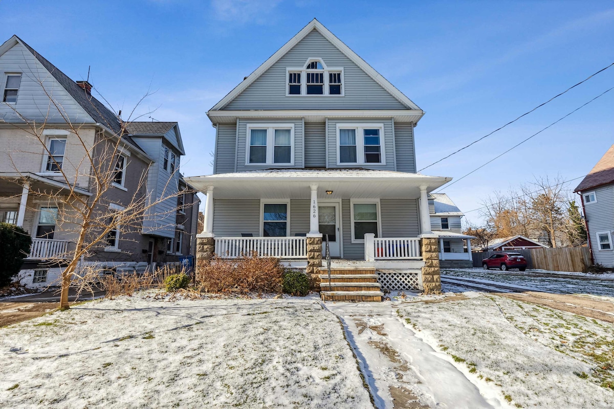 This charming 1920-built apartment, nestled in a working-class historical neighborhood of Cleveland, offers a perfect blend of historic character and modern amenities, ideal for your next Cleveland getaway. - Dedicated work station w. a computer monitor - Up to 2 car off street parking - Central AC - Dogs are welcome! $50 pet fee per dog per stay. Sorry no cats. - NO unregistered overnight guests are permitted. NO parties or gatherings - 5 minutes to downtown Cleveland
