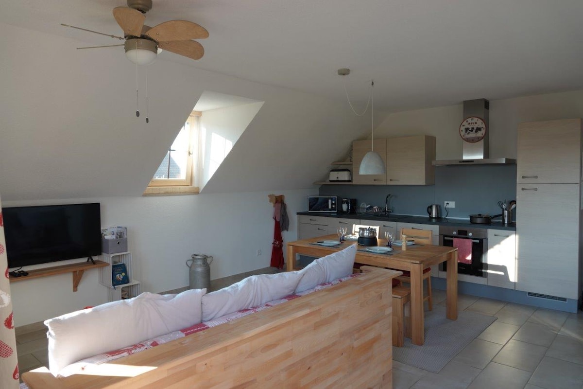 Bienvenido a «Es Guinchets», un alojamiento tranquilo y cálido, a las puertas de la naturaleza. Este amplio apartamento abuhardillado de 125 m² se encuentra en el último piso de una casa de dos niveles y es accesible en ascensor. Situado en una zona tranquila a las afueras de Domdidier, este acogedor apartamento es el punto de partida ideal para muchas excursiones (Morat y la región de los Tres Lagos, Friburgo, Berna, Lausana, Neuchâtel).
