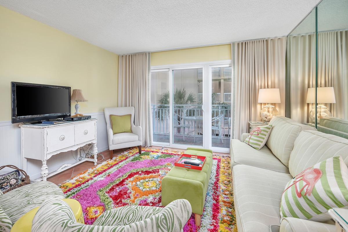 Comfort, relaxation, and beauty await you here - On the quieter and most private side of the Beach Club - with direct, gated beach access . Enjoy our oceanside saltwater pool, 2 hot tubs, and lush gardens - in the perfect spot, on one of the prettiest beaches in the South! Primary suite with king bed, walk-in shower/soaking tub. Second bedroom with 1 queen/ 1 twin, full bathroom. Well-equipped kitchen, full balcony... Come on, the dolphins are waiting for you!