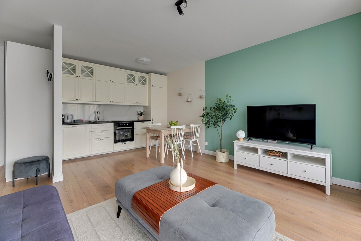 Apartment situated ca. 1,5 km away from the beautiful beach of Brzezno, ca. 1,6 km from Energa Stadium, ca. 6 km from Old Town Gdansk and ca. 4,2 km from Oliwa Archcathedral. Newly-built object consists 3 buildings, that allow a shared use of a gym, sauna, playroom for children. Playground outside. Private parking. Malls nearby. Apartment 54 m^2 + terrace. Separate bedroom. Kitchen combination with living room. Apartment recommended to demanding guests, excellent location.