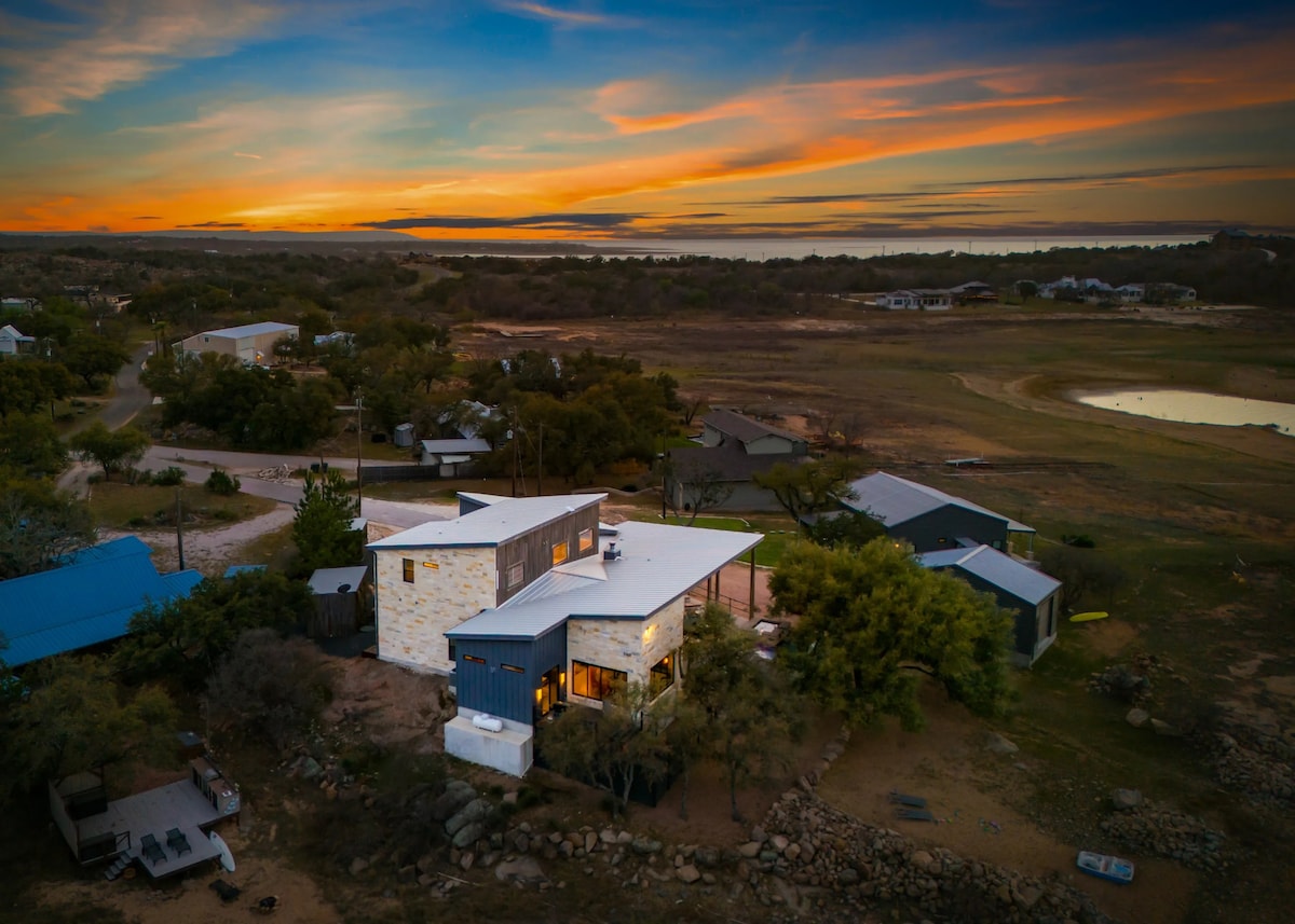 * ¡El lago está 100 % lleno a partir del 8/5/25 y la rampa de botes gratuita de Llano está abierta al otro lado de la calle!* Disfrute del epítome del lujo en Black Rock Ranch, con 3,000 pies cuadrados 5b/3.5b ubicado en una extensión de 3 acres en la cima de una colina. Disfruta de nuestra pequeña piscina de 10'x6' y nuestra cocina de cabaña al aire libre con vistas inigualables de 180 grados del lago Buchanan. Nuestra ubicación en la cima de una colina garantiza que cada amanecer y atardecer sea una obra maestra única. Situado cerca de las aguas cristalinas del lago LBJ (12 min), el lago Inks (12 min), el lago Buchanan (3 min), el lago Llano Boat