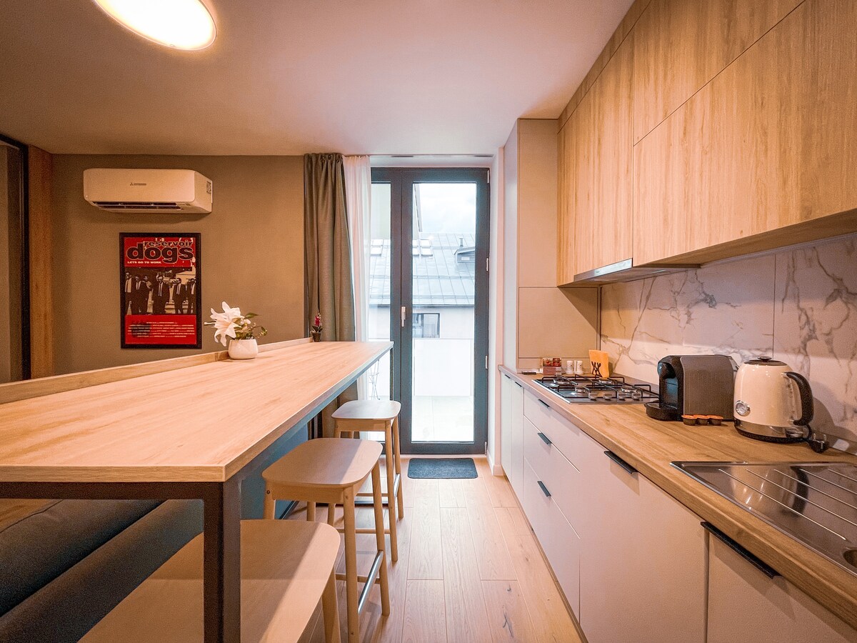 Amplio y lujoso estudio de 40 m² en el corazón de Bucarest, a pocos pasos del casco antiguo de la ciudad. Recientemente renovado, el departamento cuenta con una decoración elegante, una cómoda cama queen (180 × 200 cm), un sofá moderno, un balcón acogedor, una cocina grande totalmente equipada y un baño espacioso con ducha de efecto lluvia. Ofrecido por un Superanfitrión con más de 7 años de experiencia. Metro justo al lado del edificio. Cafetería, pastelería, minimercados, comida rápida, cajero automático y cambio de divisas en la planta baja.