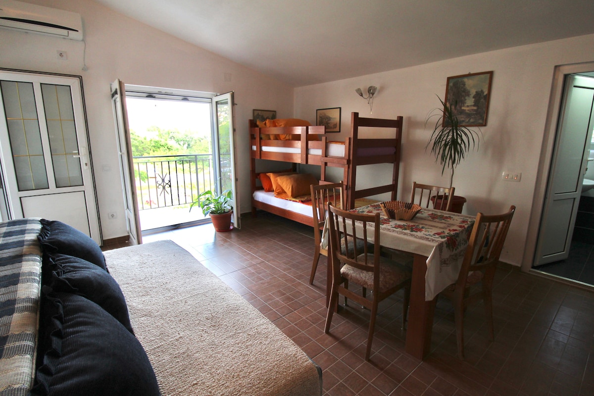 This, very modest little studio apartment, is ideal for single travelers or younger couples who are not looking for luxury and comfort,but rather prioritize a great location and budget travel.The greatest value of this listing is its location.Being able to wake up in the morning and make just a few steps to go for a swim, or to simply enjoy your time on a very nice little terrace while being surrounded by olive and laurel trees is what gives value to this tiny studio.Please read the description!