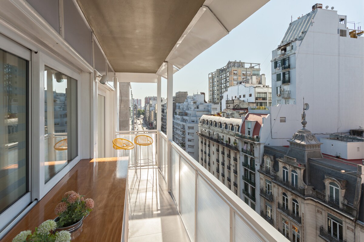 Ubicado en el corazón pulsante de la ciudad. Remodelado recientemente mezclando el estilo original del edificio de 1936 con las comodidades modernas. En el último piso de un edificio en esquina, con seguridad las 24 horas y 2 ascensores, con 2 dormitorios y balcón corrido con plantas, desde donde disfrutará de vistas de 270° del Obelisco, Av. 9 de Julio y Av. Corrientes. Aire acondiconado en ambos dormitorios y lavasecarropas, WIFI, cocina totalmente equipada, todo con estilo moderno y chic