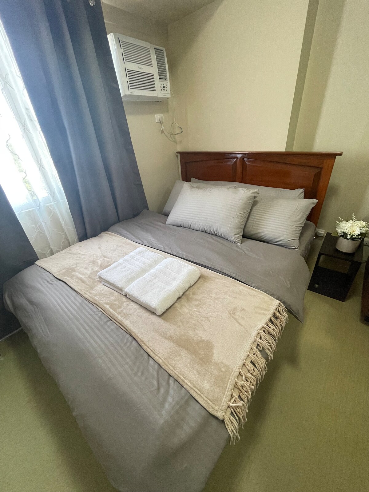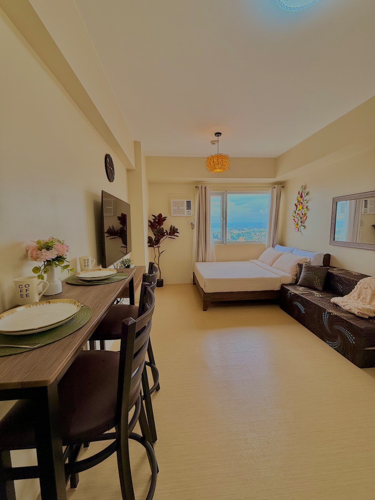 La unidad de apartamento está a poca distancia a pie de restaurantes, tiendas, un hospital y el centro comercial Ayala. El entorno es seguro. Hay seguridad las 24 horas y personal asignado en el vestíbulo. En el edificio hay ascensor. El interior de la unidad de estudio es acogedor y cómodo. Viene con 2 camas de matrimonio. Puede alojar hasta 3 huéspedes. Se proporciona conexión wifi a internet, ideal para llamadas por internet y navegar por la web.