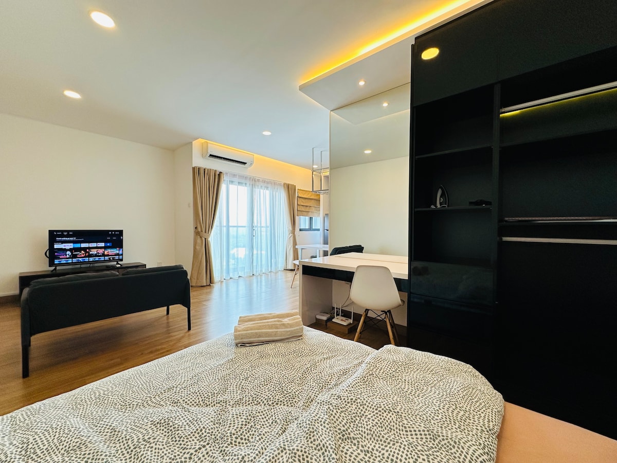 Te damos la bienvenida a nuestro estudio de Airbnb de súper higiene. ✤ WI-FI GRATIS Hora de llegada✤ fácil y flexible ✤ Filtro de agua incluido Televisión en vivo✤ internacional (más de 100 canales) Un acogedor SOHO-Studio junto al Pabellón Bukit Jalil. Equipado con una cama tamaño queen y colchones en el piso ** para grupos de 3 huéspedes. ✤ Desinfectante para la máxima tranquilidad ✤ Abraza la naturaleza con Greenie Plants ✤ Comida, tiendas, tiendas cercanas. *Se aplican los Términos y condiciones. ** Se proporciona solo para terceros huéspedes