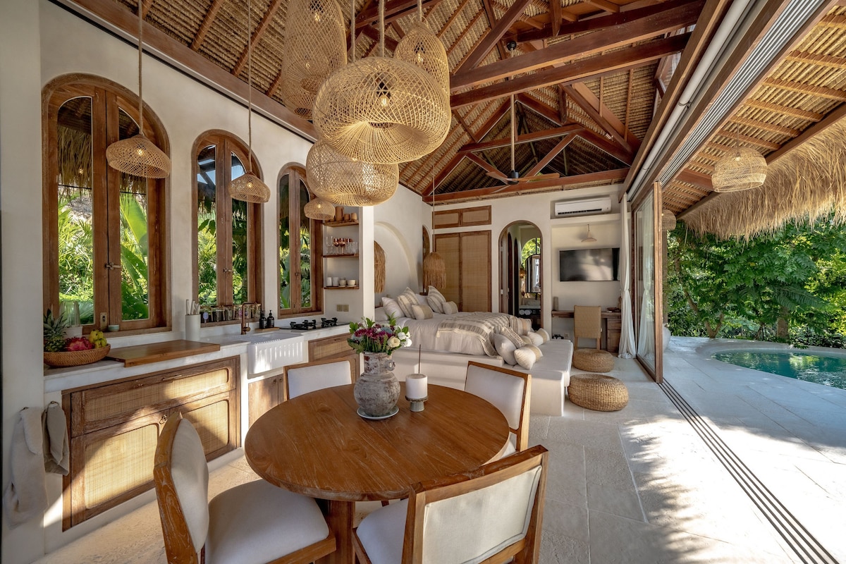 ¡Da la bienvenida a nuestra lujosa aerolínea privada de un dormitorio en Pecatu! Nos aseguramos de que tu estancia sea muy especial con: Opciones de entretenimiento como una estación de juegos y juegos de mesa. Una sala de estar totalmente climatizada con un televisor inteligente de 75 pulgadas. Tu propia piscina privada con vistas al mar. Relajante sauna compartida e instalaciones de hidromasaje. ¡Disfruta de la simplicidad y el lujo combinados para disfrutar de una estancia inolvidable en Pecatu! Nota amistosa: La villa está sujeta a un poco de ruido debido a la construcción en curso a metros de distancia.