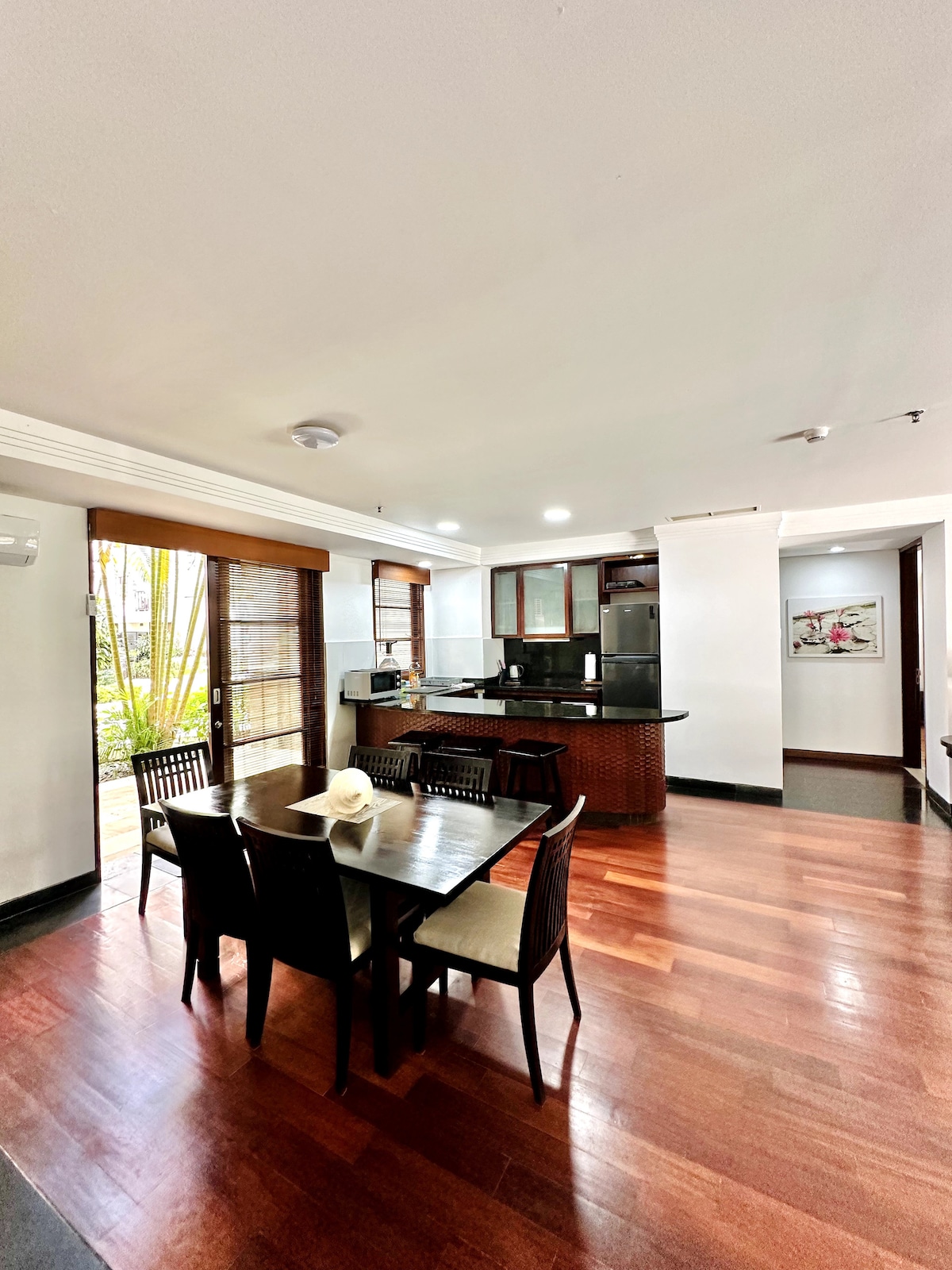 Nuestro Condominio dentro y mantenido por Novotel Hotel Resort at Bali Nusa Dua ITDC Complex. Esta residencia tiene 150 metros cuadrados en el primer piso con 2 dormitorios y 2 baños. La habitación principal está conectada con un amplio baño privado y tiene una terraza orientada al jardín principal. Ofrecemos cama supletoria y sofá cama para huéspedes familiares adicionales. Protocolo sanitario del hotel para todos los huéspedes y limpieza de todas las habitaciones con desinfectante antes de la llegada y después de la salida de los huéspedes.