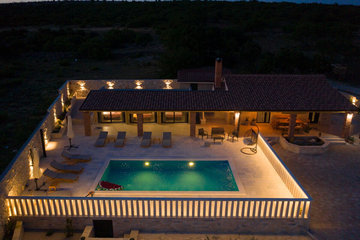 Esta hermosa villa con piscina climatizada, bañera de hidromasaje y sauna se encuentra en un paisaje remoto y aislado con una vista impresionante del valle. Piscina climatizada de abril a noviembre ¡Un lugar ideal para relajarse y un punto de partida para explorar la región y Croacia! Distancia a la ciudad Zadar está a 28 km (aeropuerto a 20 km) de distancia. Šibenik está a 50 km de distancia. Split está a 125 km (aeropuerto a 99 km) de distancia. Distancia a la atracción Lagos de Plitvice a 125 km. Krka a 45 km de distancia Kornati a 30 km de distancia