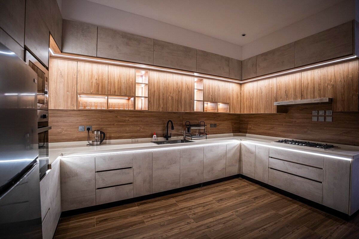 Disfruta de una estancia excepcional en este lujoso apartamento que combina el carácter contemporáneo y la identidad cultural de la región de Qassim. Diseñado cuidadosamente para darte una sensación de calidez y pertenencia, con detalles decorativos inspirados en colores y formas elegantes de la herencia, mezclados con elegantes toques de hotel. El apartamento tiene 3 dormitorios elegantes y cómodos, una cocina totalmente equipada con todas las herramientas y electrodomésticos necesarios para preparar tus comidas con comodidad, así como un salón de lujo con un espíritu lujoso, y tres baños modernos con acabados elegantes que ofrecen la máxima comodidad y privacidad.