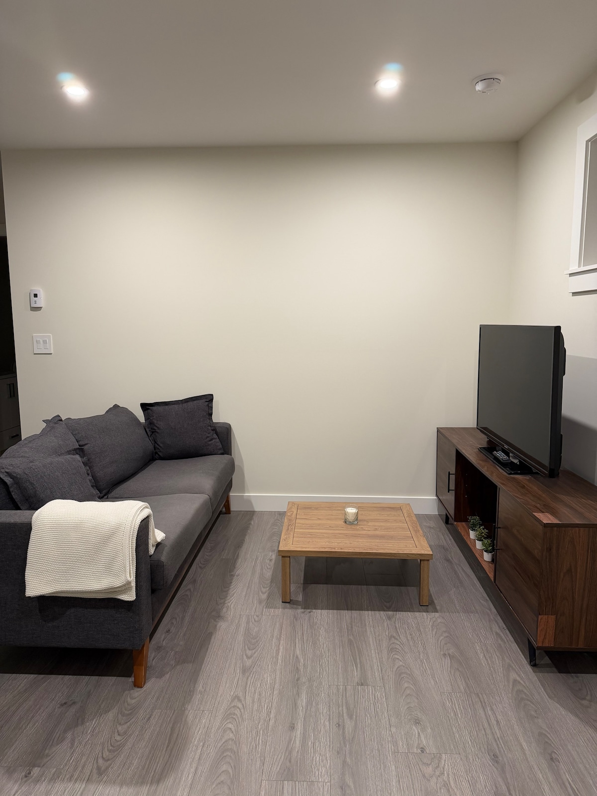 Modern, bright basement studio with queen bed and sofa bed. Fully equipped kitchenette includes cooktop, microwave, kettle, cookware, and flatware. Private bathroom with large walk-in shower and in-suite washer/dryer. Located in a quiet neighborhood near SFU—easy access by foot, transit, or car. Just 30 mins to Downtown Vancouver by car, or 45–60 mins by transit. Clean, comfortable, and stocked with all necessities. Note: We love pets but we DO NOT allow cats.