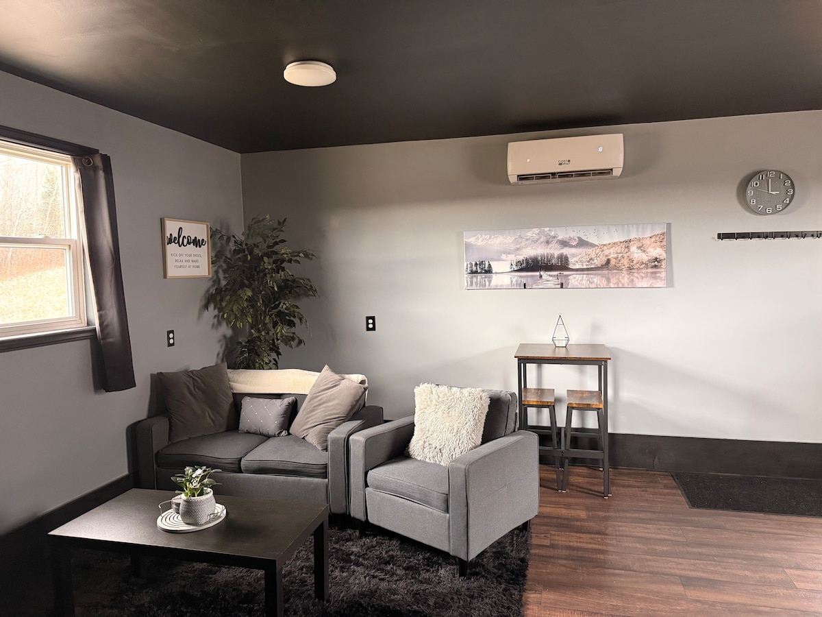 Bienvenido a 11 Doherty Lane en el precioso valle de Waterford. Estamos situados a solo 100 yardas de la estación de esquí de Poley Mountain. La propiedad también tiene acceso privado a senderismo, ciclismo, raquetas de nieve, motos de nieve N.B. y senderos para todoterreno. El espacio es toda la planta baja de la casa, que incluye tu propio dormitorio privado, baño, entrada, sala de estar y zona de bar. La zona del bar incluye cafetera, microondas, mininevera y horno tostador. No es un espacio ideal para cocinar.
