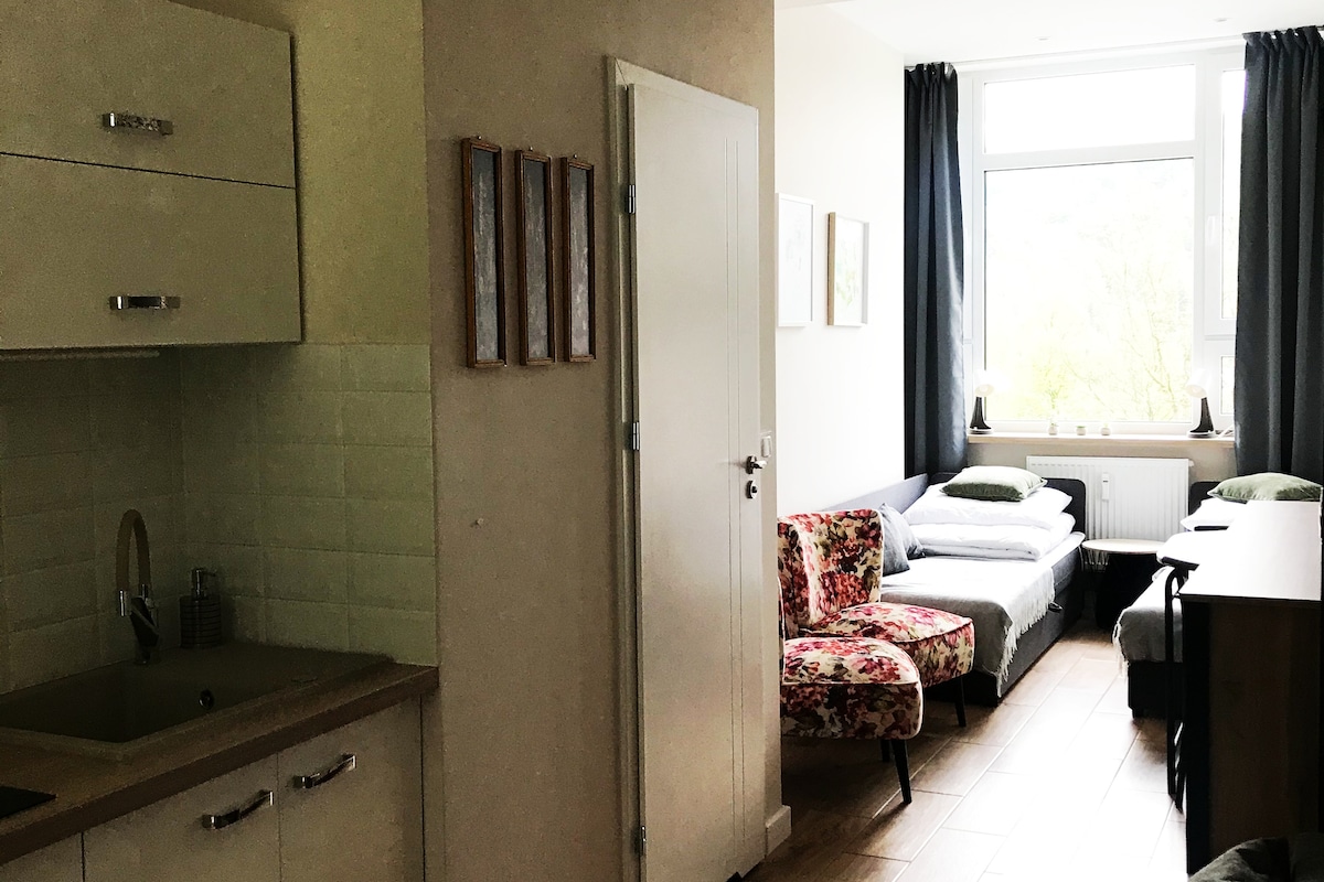 Un apartamento espacioso recién reformado en el centro de Bielsko-Biała: - 47m² - Cocina totalmente equipada. - 2 dormitorios - Vistas al parque de 180⁰. - Wifi de 100 Mbps. - Acceso a un gimnasio al aire libre y a una pista de atletismo de tamaño completo. - Parque infantil.