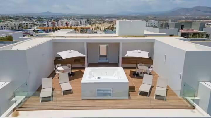 Disfruta de nuestro departamento a solo 3 cuadras de Playa Médano, la playa más popular para nadar, rodeada de restaurantes, beach clubs y actividades. Ideal para familias o grupos de hasta 6 personas: • 3 recámaras cómodas • 3 baños completos • Cocina totalmente equipada • Wifi rápido • Aire acondicionado en todas las áreas Amenidades tipo resort: • Alberca • Jacuzzi en rooftop • Gimnasio • Estacionamiento privado 🎁 BONUS: Transporte aeropuerto (SJD–CSL) incluido para hasta 2 huéspedes.
