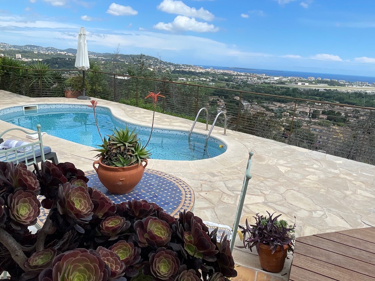 Appartement terrasse totalement indépendant, avec vue panoramique des montagnes à la mer dans une bergerie du XVIIIème siècle au cœur d'une forêt classée, en plein soleil et au calme absolu, avec piscine chauffée du 1er Avril au 31 Octobre, jacuzzi, salle de billard, baby-foot, terrain de pétanque, chemins de randonnée pédestre devant la porte d'entrée. L'emplacement idéal de la propriété à 20mn de l'aéroport et de la mer, permet de visiter aisément tous les plus beaux sites de la Côte d'Azur.