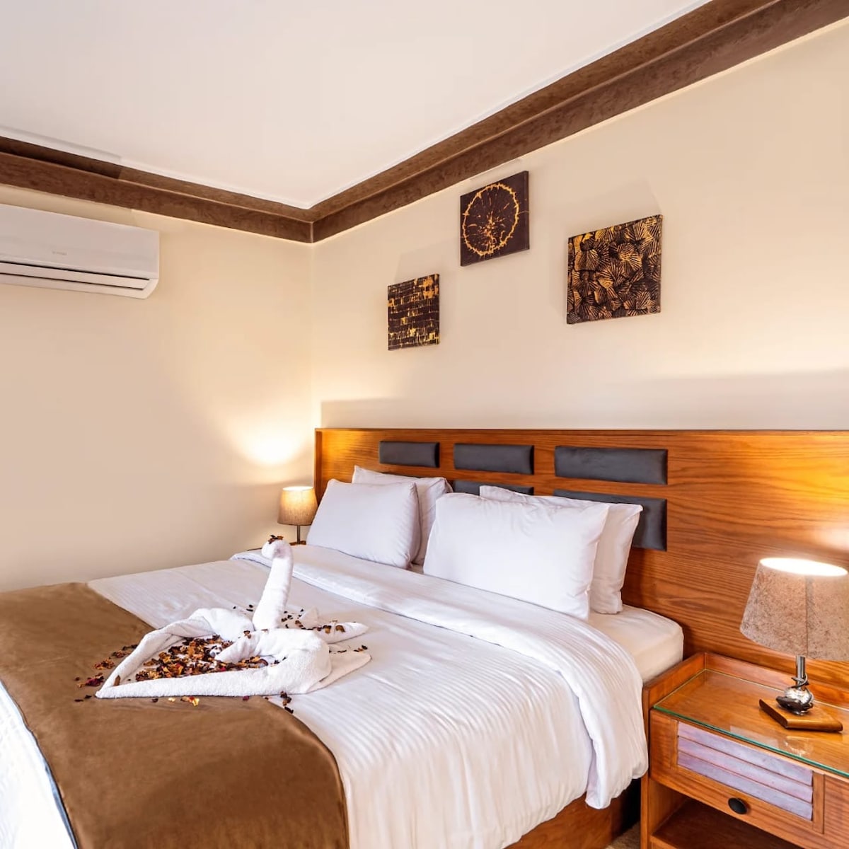 Alojamiento de ensueño del viajero: comodidad, estilo y estilo moderno. Acogedora cama doble, 2 mesitas de noche para artículos básicos, escritorio de trabajo dedicado, TV inteligente y wifi gratuito: todo en una habitación para tu aventura en El Cairo.