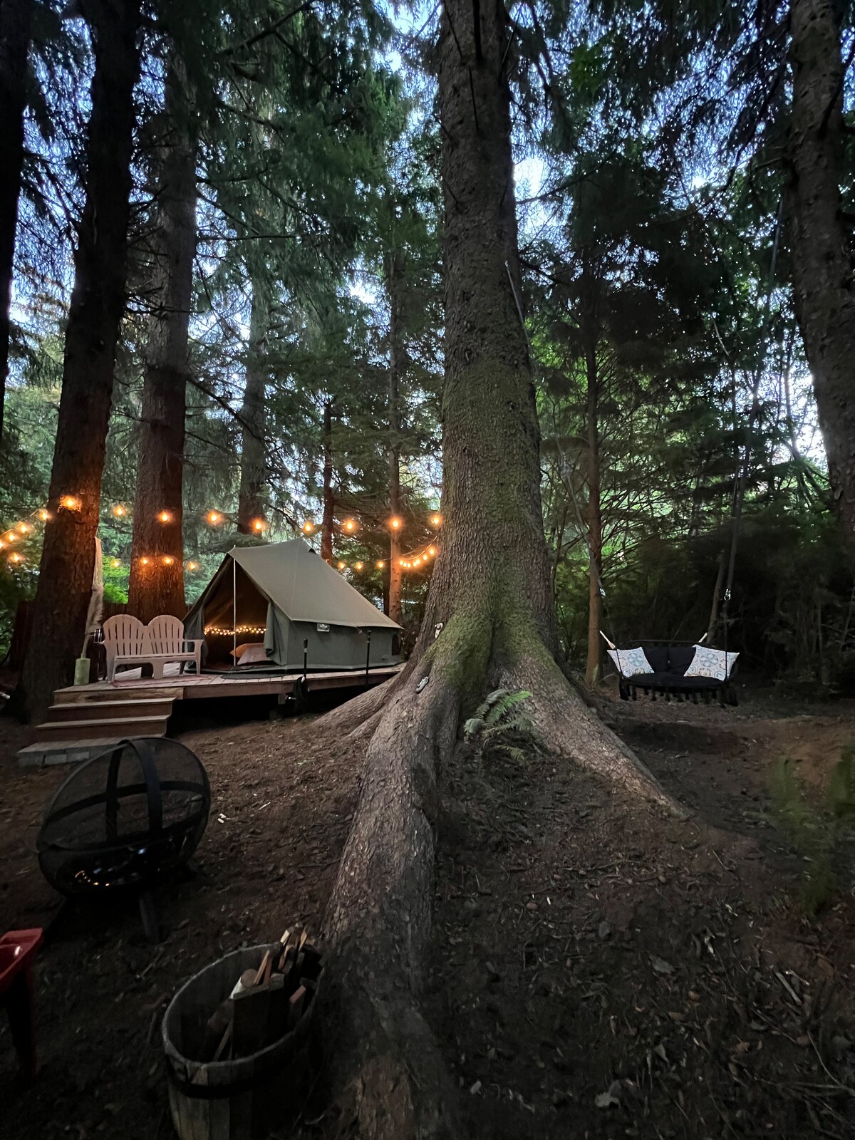 Breathe deep in nature on Kings Mountain CA. Our safari-style tents blend comfort and adventure with real beds, down comforters, cotton linens, lighting, indoor/outdoor furniture, a mini fridge, and a stove. Each tent sits on a wooden deck overlooking the ocean and the surrounding forest. Enjoy light cooking, fireside chats, and cozy mornings—thoughtful touches make your stay relaxing. Location: 30 min from SFO, 40 min from San Francisco, 30 min from Palo Alto, 20 min from Half Moon Bay.