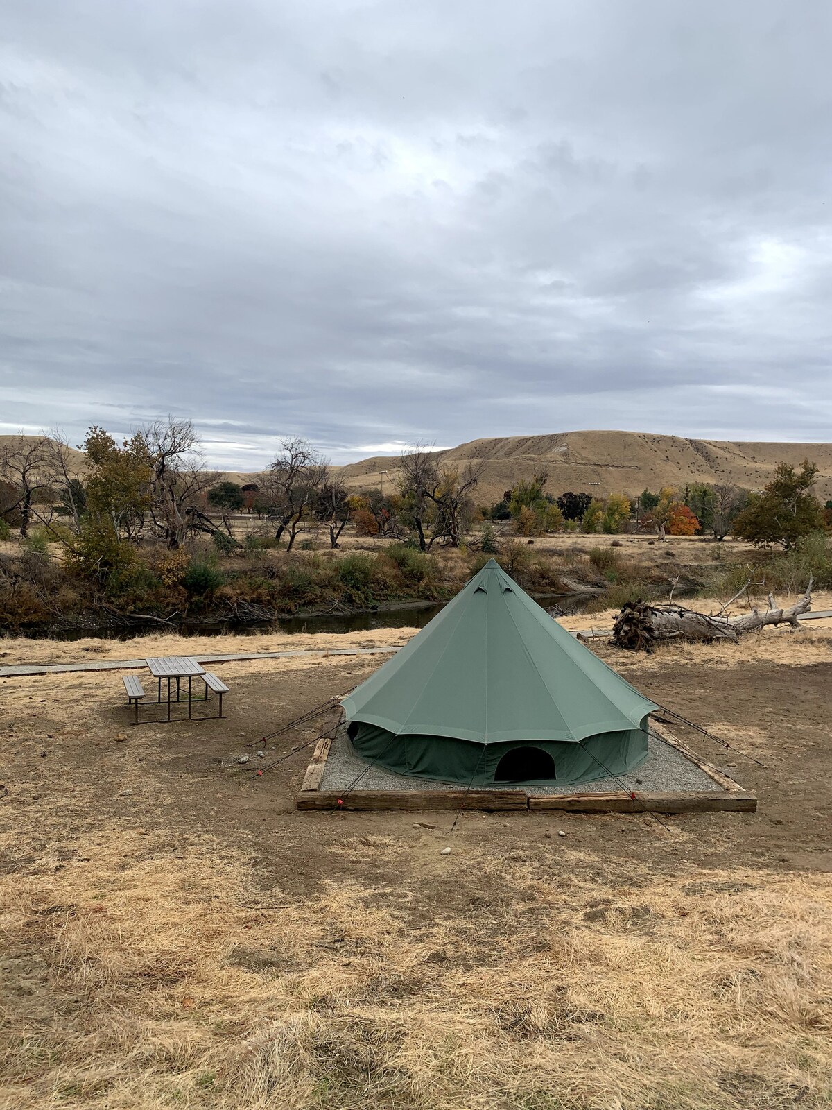 Disfruta de una experiencia de glamping ecológico en este retiro en la ladera de una colina en un rancho de ganado. La lujosa tienda de campaña con energía solar cuenta con una pequeña cocina, ducha exterior, baño exterior privado, porche delantero cubierto y un pozo para encender el fuego. Disfruta de amplias vistas al valle. Este lugar exclusivo, único y aparentemente aislado del mundo solo es accesible por un camino privado. Privado y rústico, ¡esto es glamping en su máximo esplendor! Temporada: abril a octubre.