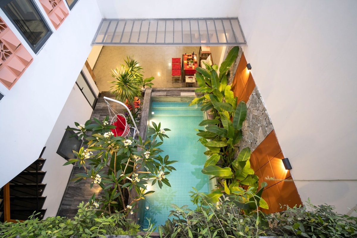 Nuestra villa de 6 dormitorios tiene capacidad para 12 huéspedes y niños menores de 6 años. Villa se encuentra justo en el centro de la ciudad, cerca de las famosas atracciones turísticas de Da Nang, solo te llevará de 2 a 5 minutos mudarte a atracciones turísticas como: My Khe Beach, Bac My An Market, Marble Mountains. Son, Dragon Bridge, Love Bridge, Helio Amusement Center, Lotte Mart, Asia Park, área para que se alojen los extranjeros, puedes comunicarte fácilmente con las personas. Cámara de seguridad 24/7 Bienvenido a mi villa con piscina privada