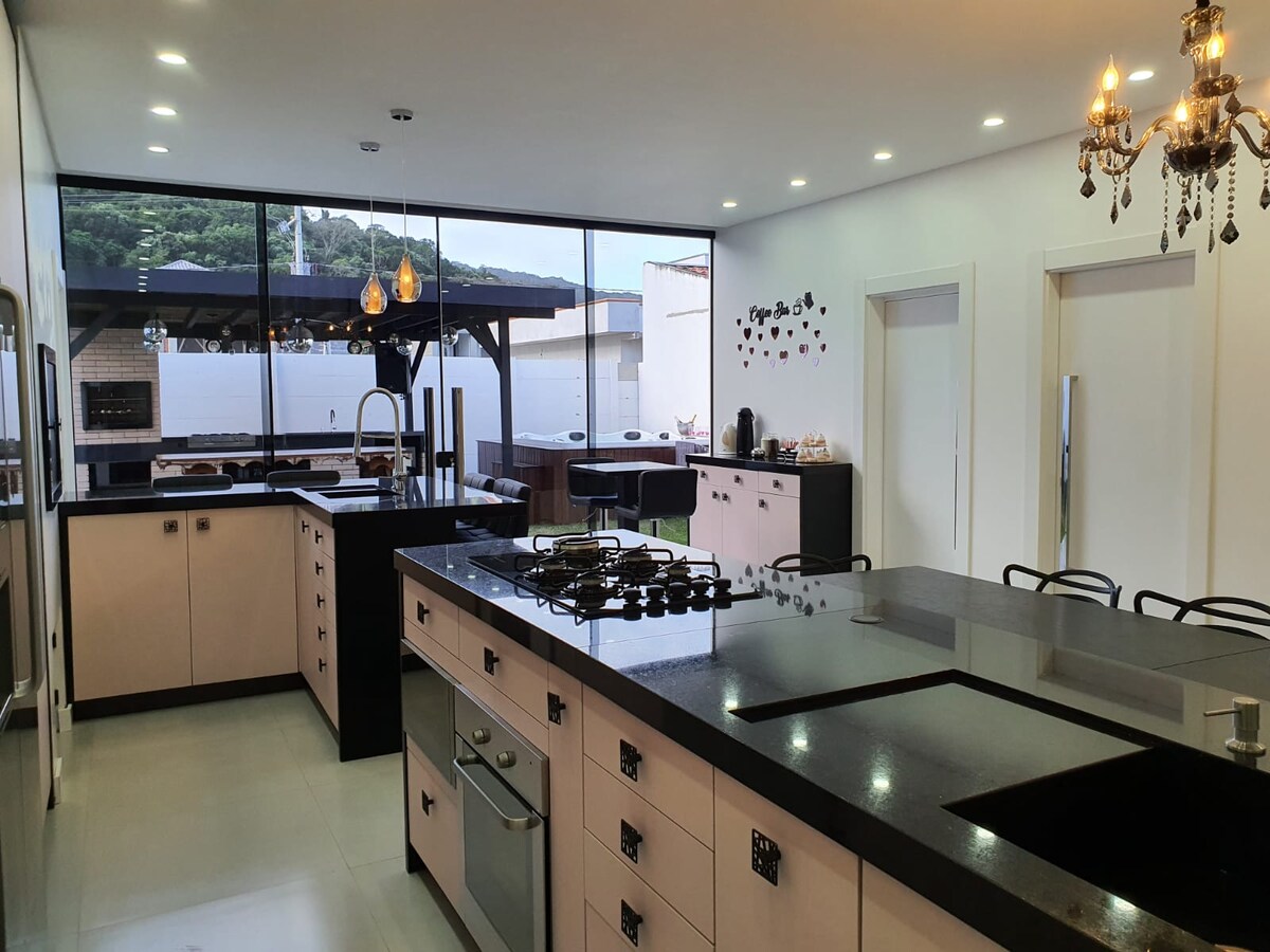 Casa em Balneário Camboriú: Cozinha ampla c/ churrasqueira, 3 quartos, 1 deles é quarto/cinema c/ tv 75”, 3 banheiros, sendo 1 suíte c/ hidro dupla, cromoterapia e tv, todos c/ ar condic. Área ext. c/ churrasqueira, jacuzzi c/ cromoterapia e efeito champanhe p/ 07 pessoas, integrada à lareira c/ poltronas, chaise long, espreguiçadeiras, som c/ bluetooth, globos espelho, máq. de fumaça e ilumin. colorida. Estacion. p/ até 3 carros, bairro seguro, tranquilo, há 5 minutos de carro da praia central.