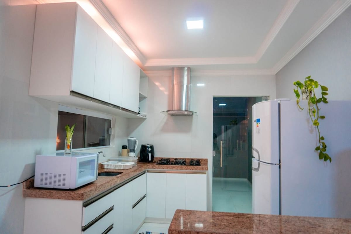 Relájate con toda la familia en este alojamiento tranquilo. Disfruta de una gran zona al aire libre, césped, piscina, ideal para niños y mascotas, así como de la terraza de barbacoa, parrilla, pinchos, una cocina con refrigerador, fogao, microondas, licuadora, sandwichera, ollas, platos, cubiertos, xicaras y vasos, y la comodidad de 3 suites con aire acondicionado para un sueño reparador. Despierta con el viento en la paja de los cocoteros o observa las estrellas después del anochecer y escucha la paz de este lugar.
