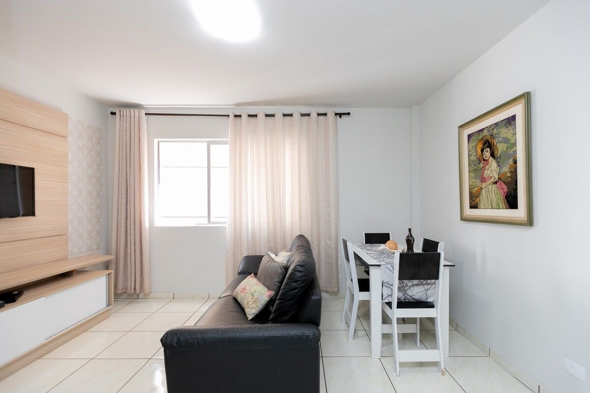 Estudio completo para (2) dos personas, con plaza de aparcamiento, situado a (1) una manzana de la PUC. Con aire acondicionado, wifi de gran velocidad, Smart TV, cama doble, cocina equipada, ropa de cama y baño, champú, jabón, escritorio, secador de pelo, plancha, junto a Shopping Estação, Carrefour y otros mercados, panaderías y restaurantes. Es súper cómodo con toda la seguridad, con llegada/salida autónoma.