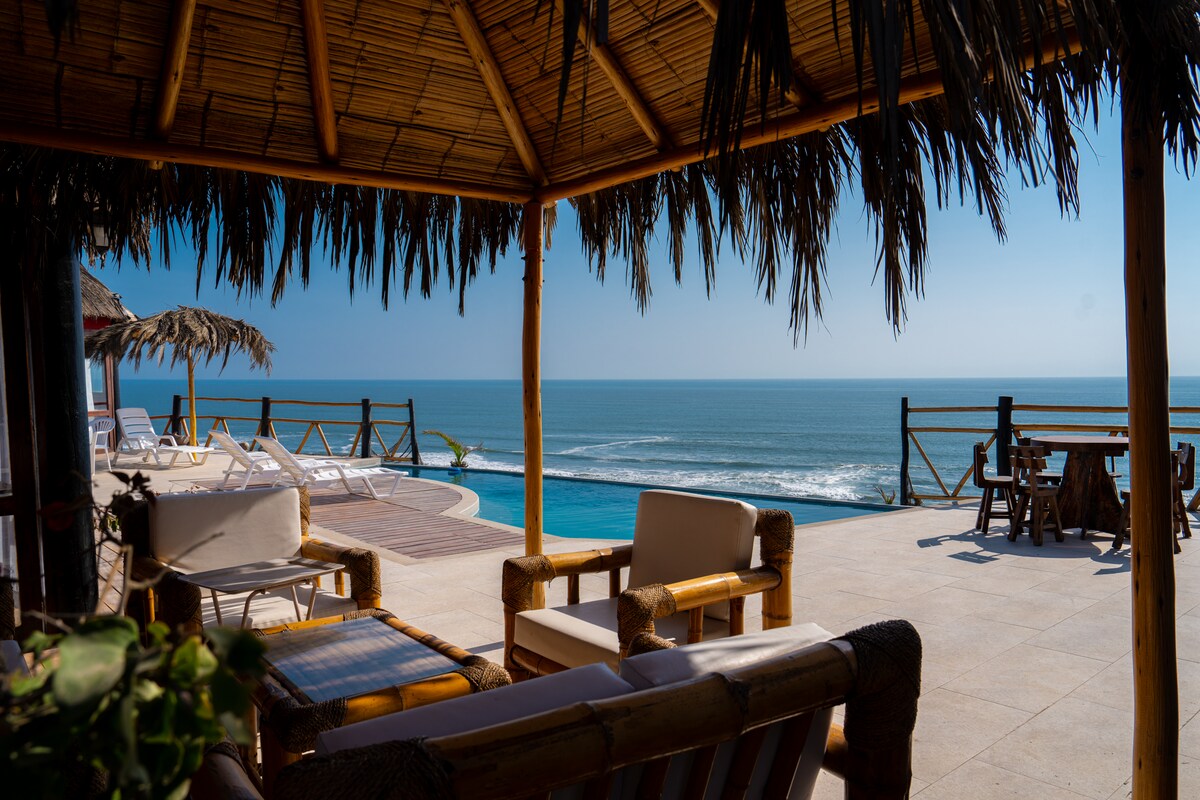 Ubicada frente al mar, relájate en esta casa alimentada de energía solar, que tiene 5 cuartos y 4 baños, ideal para grupos grandes. Cuenta con sala, comedor y cocina equipada para preparar tus platillos favoritos. La terraza privada del cuarto principal y la del 1er piso ofrecen vistas inigualables al mar, mientras que la zona de parrilla y cancha de voley son perfectas para disfrutar al aire libre. Con wifi, terma y lavandería, tendrás todo lo que necesitas para una estadía ideal.