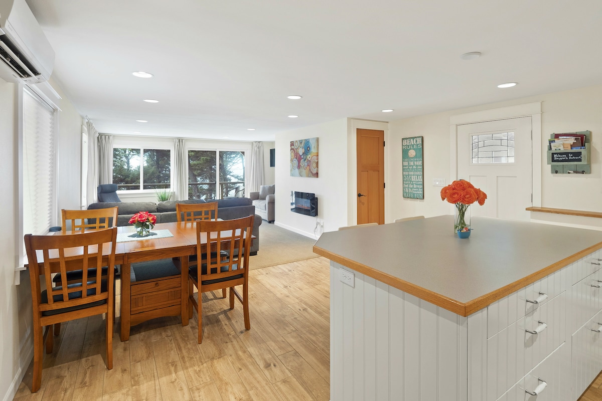 ¡Magnífica vista! Esta casa LIMPIA y contemporánea es una acogedora cabaña de 2 dormitorios y 1 baño y medio, con chimenea de gas y vistas a Three Arch Rocks, una reserva nacional. Construida de nuevo desde los cimientos en 2010 por un maestro carpintero, esta casa de campo llena de luz tiene suelos de arce, techos de madera recuperada, encimeras de granito, una chimenea de gas esmaltada, 3 terrazas privadas, una cocina completa, baño con suelo de baldosas con calefacción, lavadora/secadora y unas vistas inmejorables. Con un garaje para 2 coches, aparcar es muy fácil.