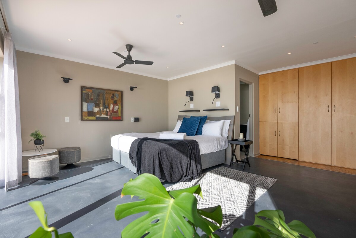 Moderna suite de 1 dormitorio decorada con buen gusto, con acabados de lujo y jardín privado con aparcamiento cerrado. Cerca de la playa de Blouberg, centros comerciales, bares, restaurantes y un hospital. Ideal para vacacionistas, surfistas o viajeros de negocios. Salón con TV inteligente de 55 pulgadas, wifi sin límites. Cómoda cama doble con lujosa ropa de cama. Cocina totalmente equipada con lavadora. Baño completo Estación de trabajo dedicada. Jardín privado con braai. Entrada cerrada segura con alarma.