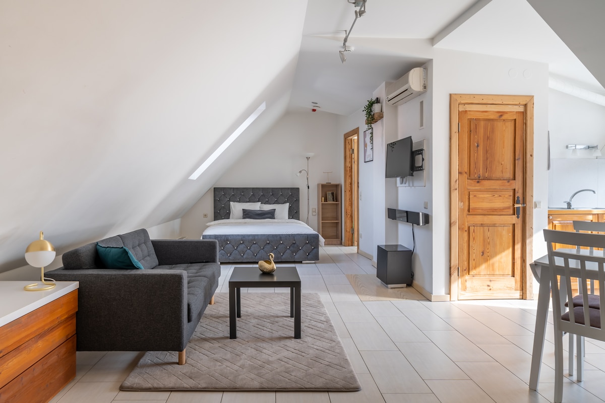 ¡Este precioso apartamento tipo estudio en la azotea es un lugar ideal para tu estancia en Riga! Se encuentra en la mejor ubicación posible: el casco antiguo. Alojarse aquí significa estar a solo unos momentos de los mejores cafés, bares, restaurantes y lugares de interés que Riga tiene para ofrecer. Gran lugar para trabajar un poco y también la hermosa terraza es una ventaja si quieres salir y ver las vistas desde arriba. El alojamiento también está situado en una parte muy tranquila del casco antiguo, que estamos seguros que disfrutarás. ¡Bienvenido! :)
