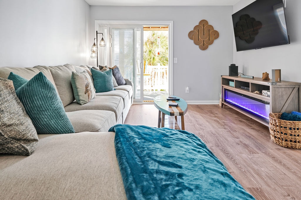 Enjoy the magic of the Christmas season with crisp coastal air and ocean views from your porch daybed, or curl up by the fireplace with a warm drink as the tree glows nearby. Perfectly located on one of the Island’s most desirable stretches of sand—home to the only year-round dog-friendly beach—with easy beach access and the Pier just steps away, this peaceful oceanfront condo blends festive charm and comfort for a cozy holiday escape.